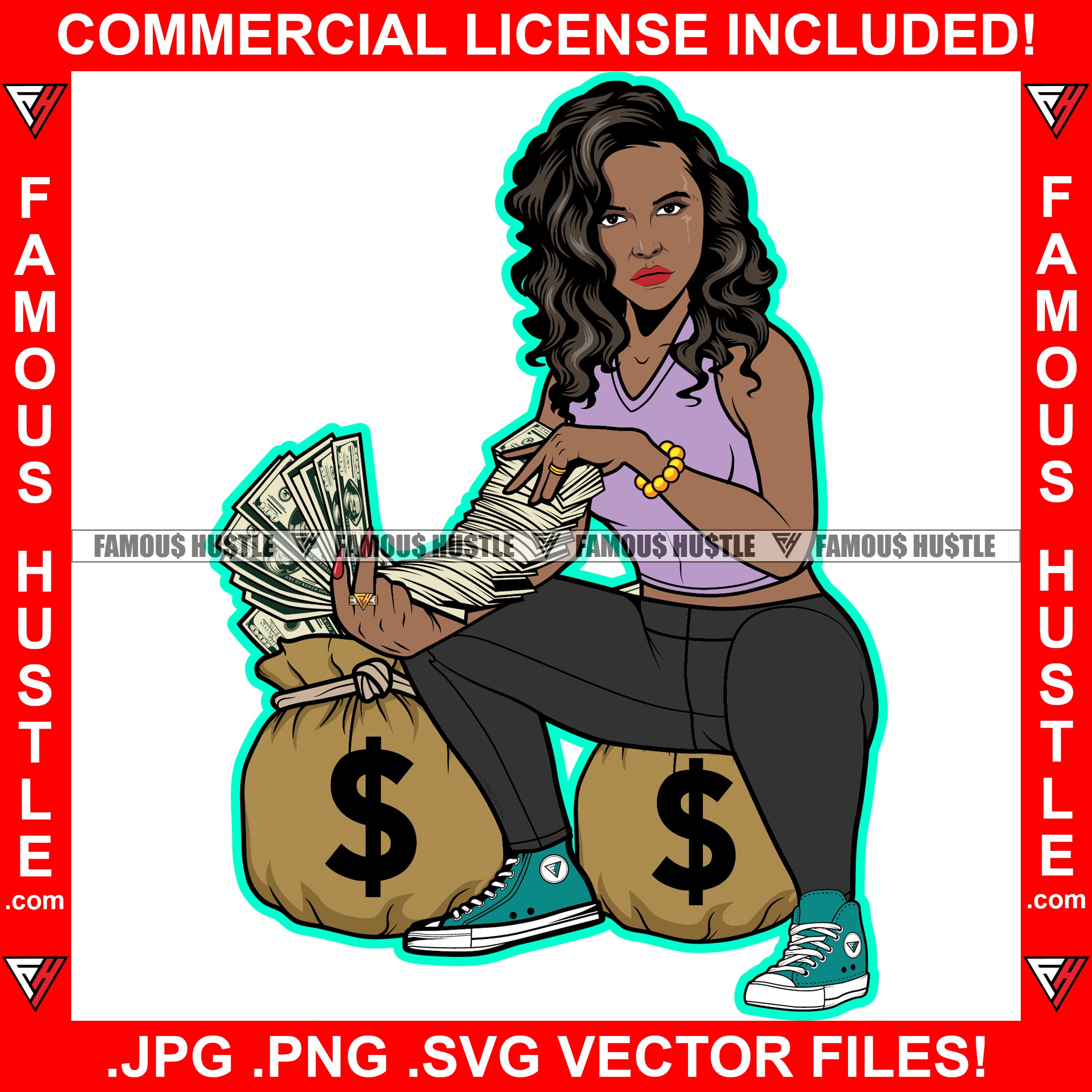 Big Dreams Sexy Gangster Black Lady Female Spreading Cash Stack Spread Arm Money Bags Gold Jewelry Tattoo Hip Hop Rap Plug Trap Street Ghetto Hustler Hustling Drip Rich Thug Famous Hustle Art Graphic Design Logo Print Printing Vector SVG Cut File