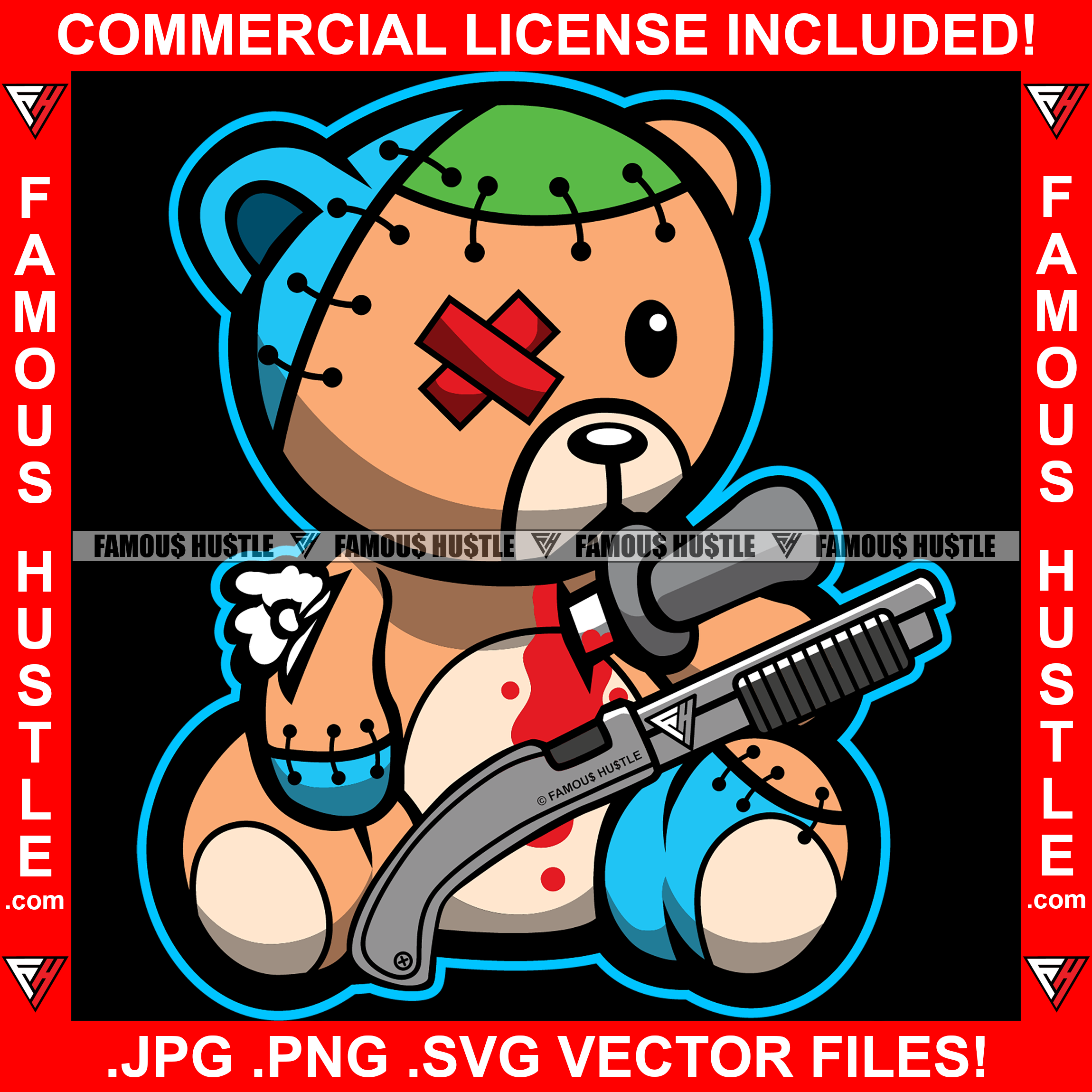 Famous Hustle Gangster Horror Beat Up Teddy Bear Scar Face Toy Torn Broken Staples Patches Head Stapled Stuffing Knife In Heart Bloody Heart Hip Hop Rap Trap Hustler Drip Boss Art Graphic Design Logo Print Printing Vector SVG Cut File