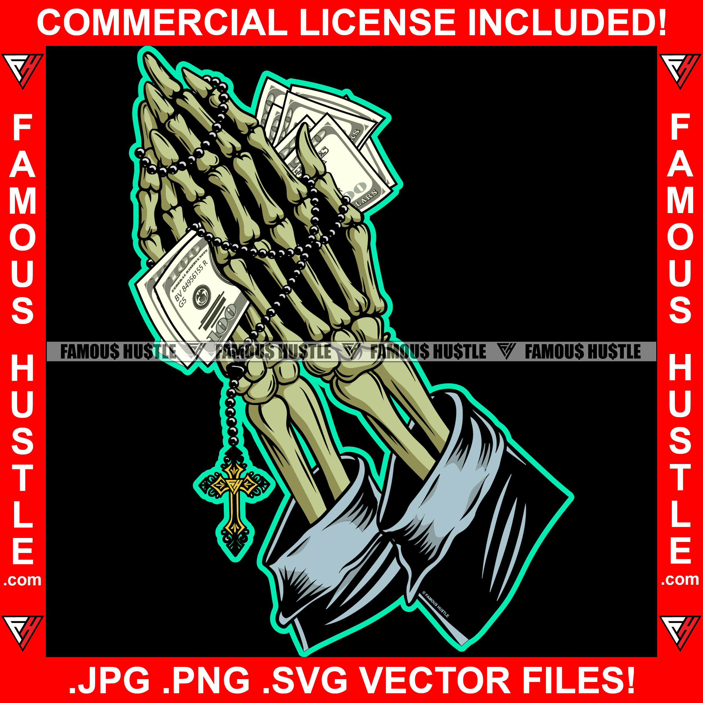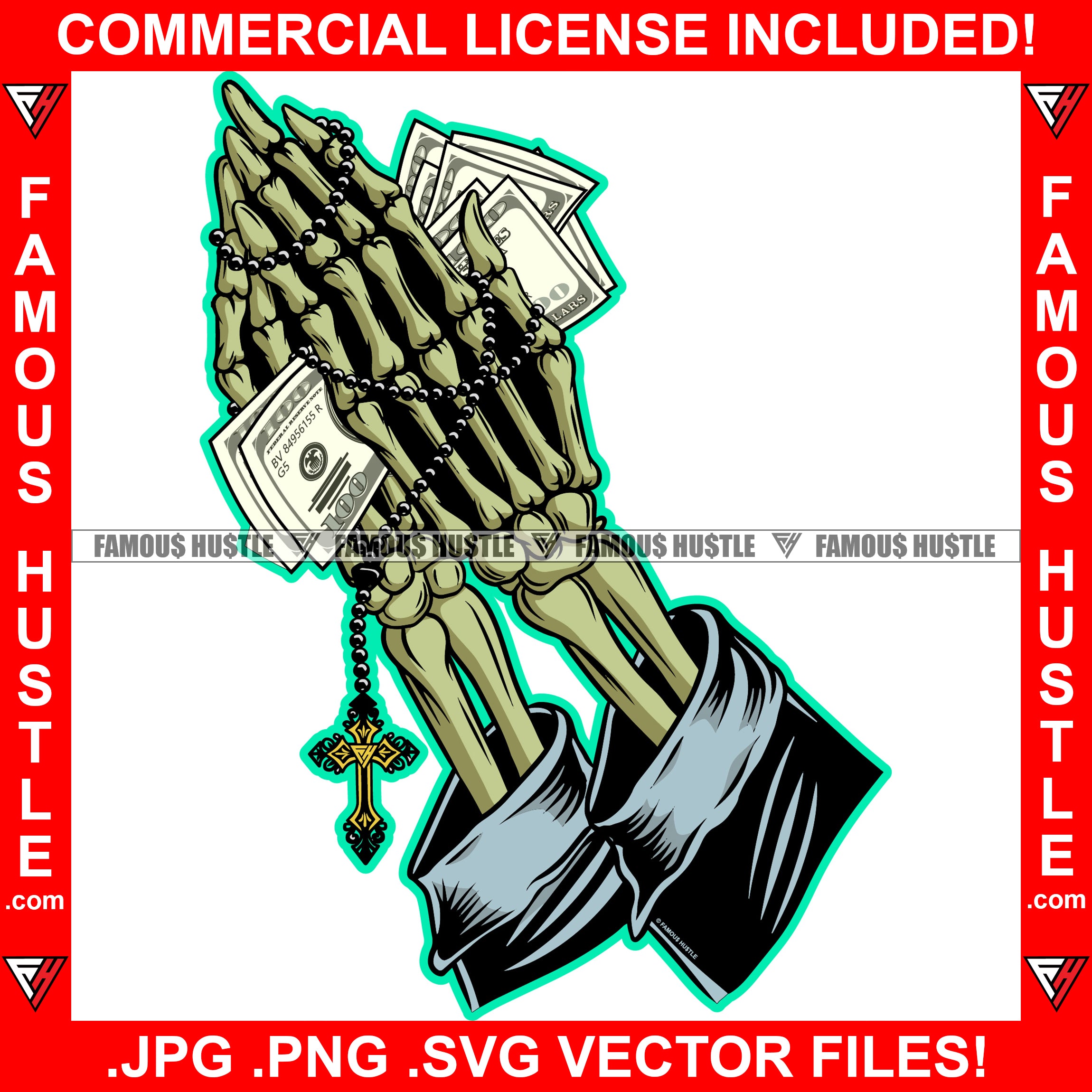 Famous Hustle Gangster Skeleton Bone Hands Cash Money Bundles Crist Crucifix Necklace Thank You Tattoo Hip Hop Rap Hustler Drip Swag Trap Hood Thug Street Mafia Mob Ghetto Art Graphic Design Logo T-Shirt Print Printing JPG PNG SVG Vector Cut File