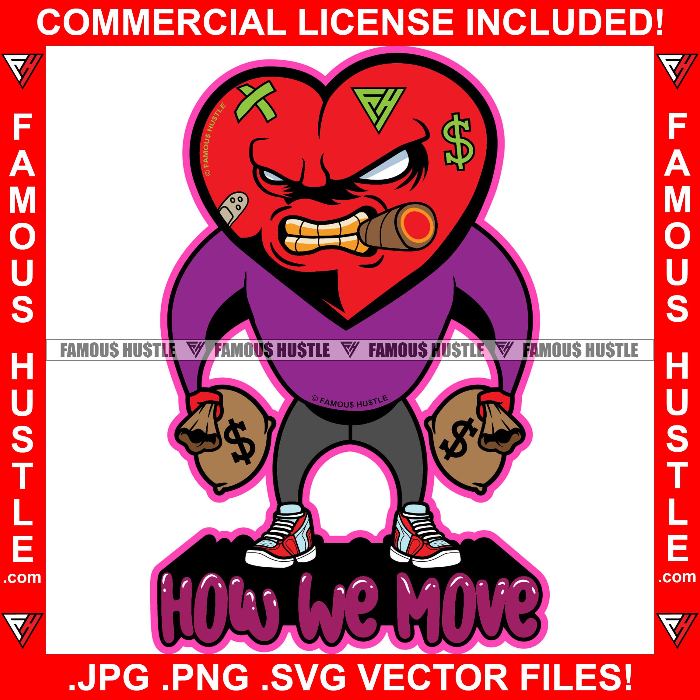 How We Move Mean Angry Red Heart Gold Teeth Cartoon Character Scar Face Bandage Cigarette Cash Money Bags White Eyes Tattoo Hip Hop Rap Trap Street Thug Flex Drip Boss Famous Hustle Hustling Quote Art Graphic Design Print Printing Vector SVG Cut File