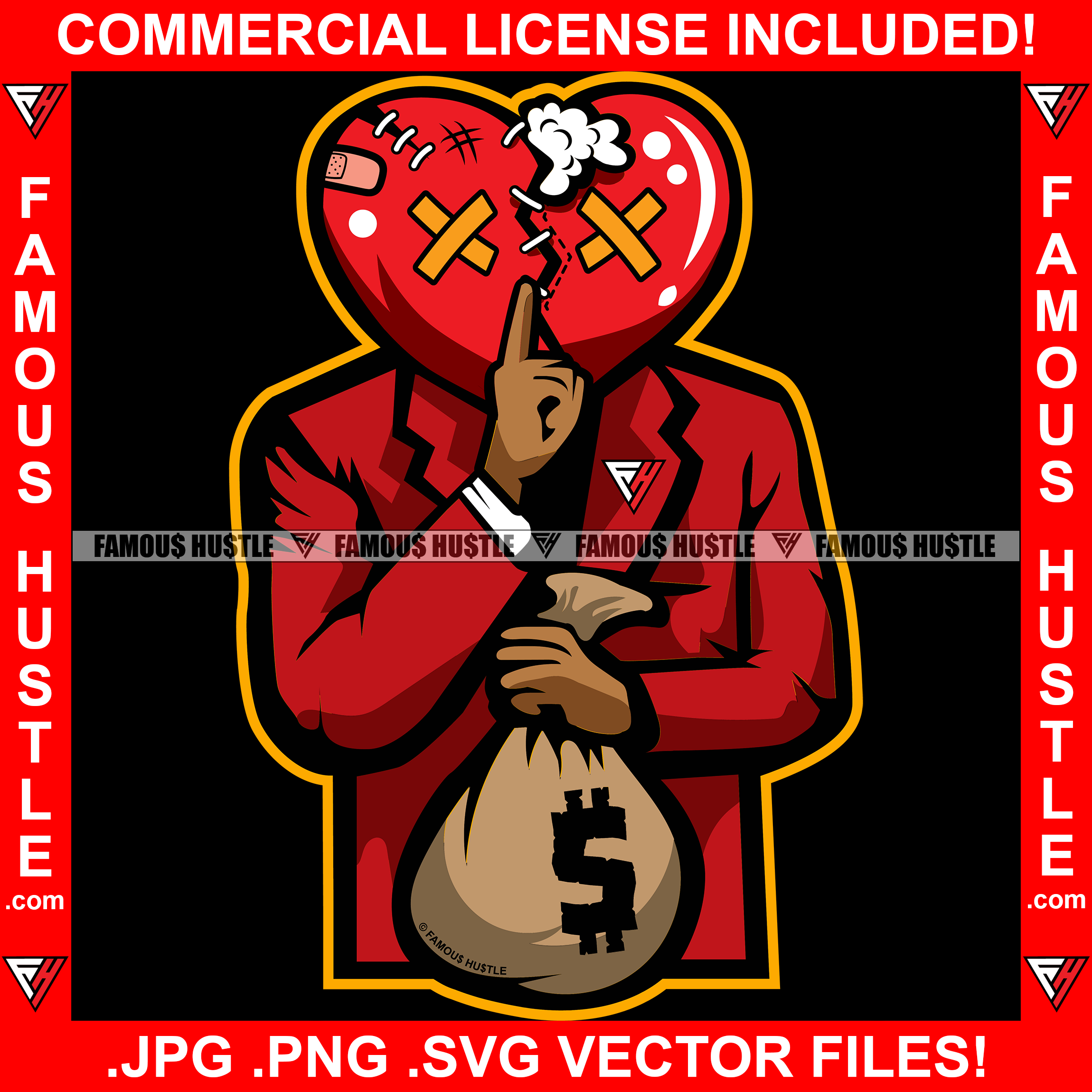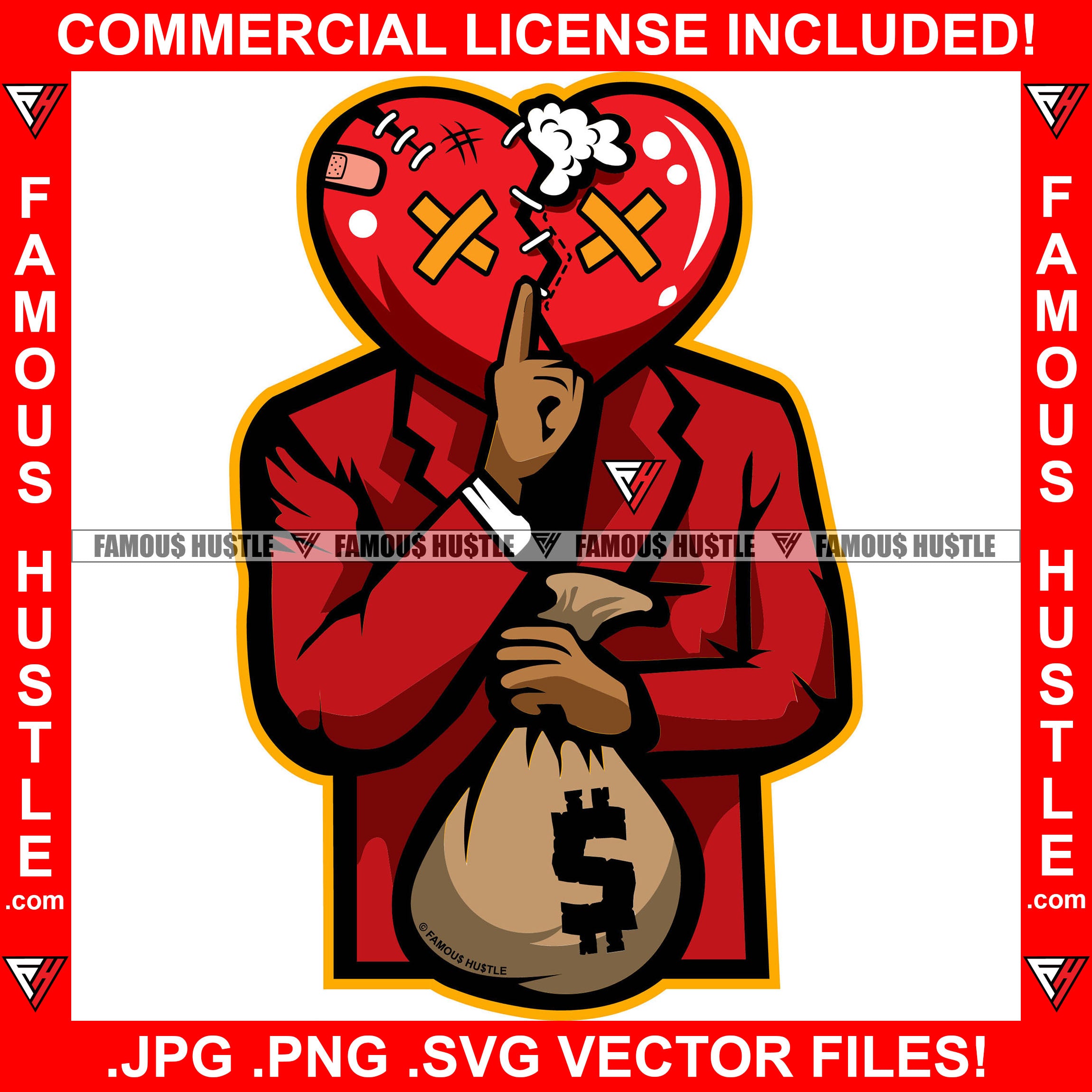Hustle Dripping Broken Red Heart Cartoon Character Stitched Eyes Staples Bandages Stuff Coming Out Cash Hand Money Bag Tattoo Hip Hop Street Hood Ghetto Swag Art Graphic Design Logo T-Shirt Print Printing JPG PNG SVG Vector Cut File