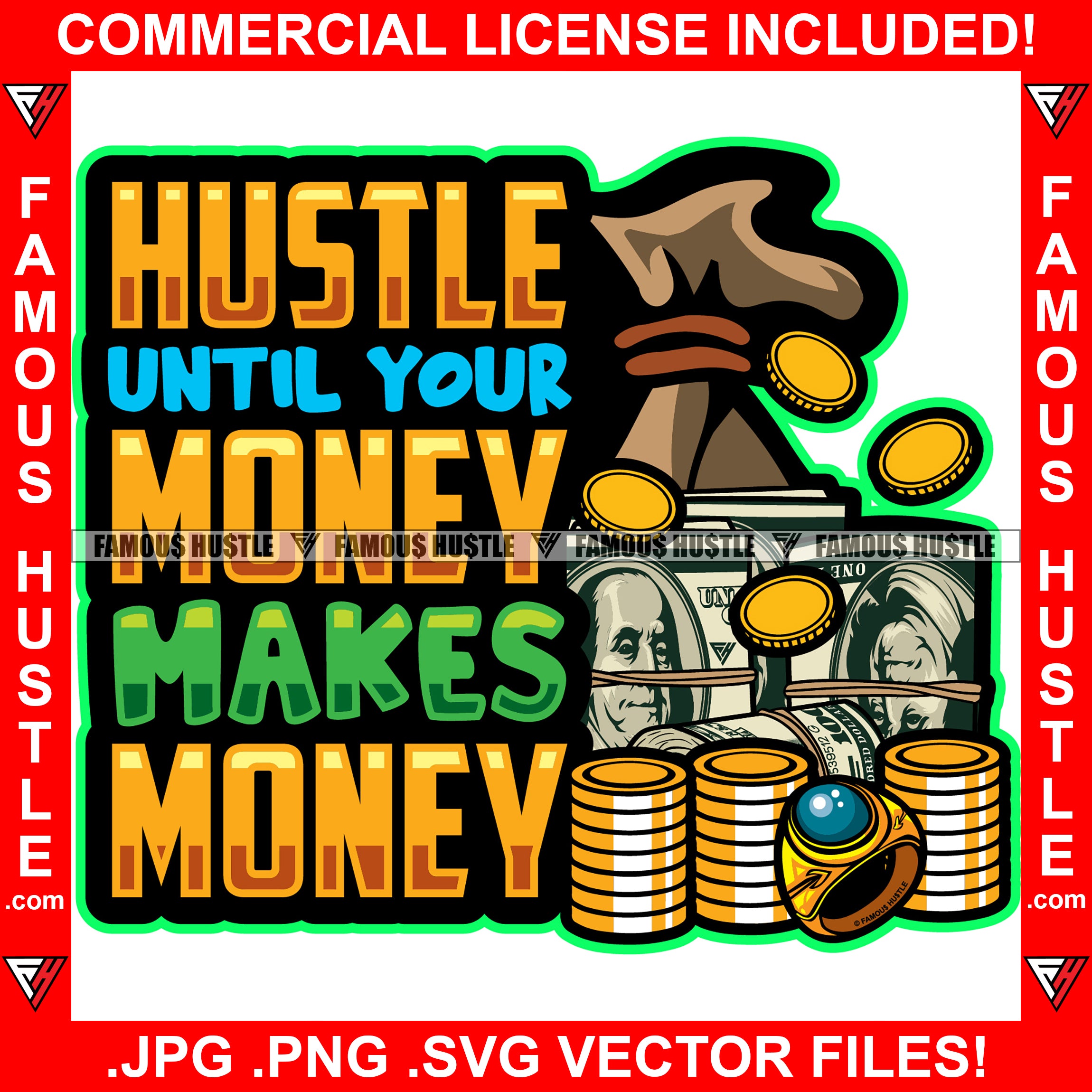 Hustle Until Your Money Makes Money Cash Bag Bundles Stack Gold Coins Ring Hip Hop Rap Rapper Plug Trap Street Hood Ghetto Swag Thug Hustler Hustling Famous Trapper Quote Art Graphic Design Logo T-Shirt Print Printing JPG PNG SVG Vector Cut File