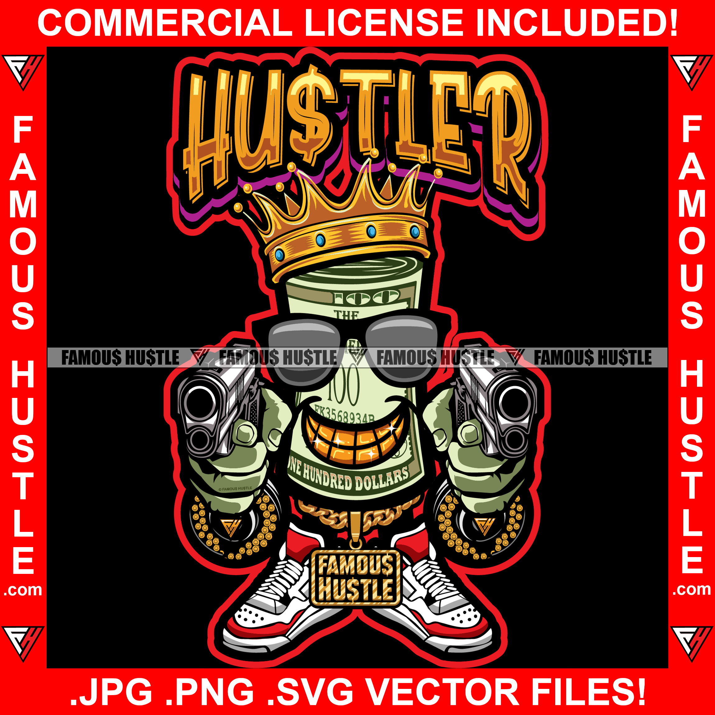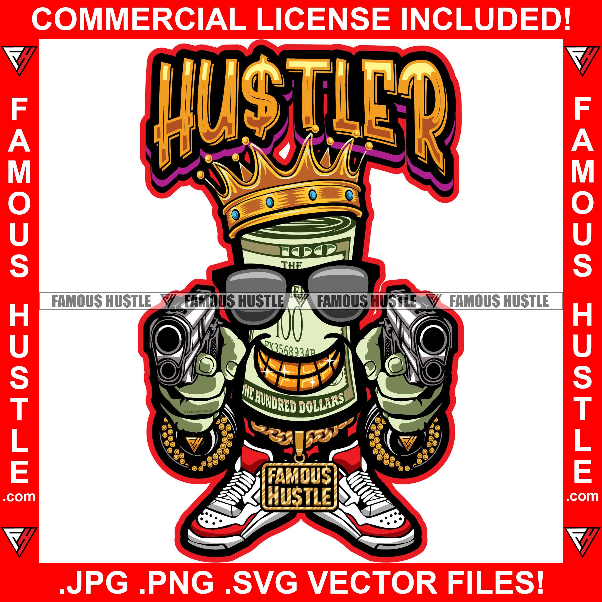 Hustler King Gangster 100 Dollar Bill Money Roll Mean Face Sunglasses Gold Teeth Jewelry Pistol Guns Sneakers Hip Hop Rap Drip Plug Trap Hood Tattoo Cartoon Character Ghetto Quote Art Graphic Design Logo Print Printing Vector SVG Cut File