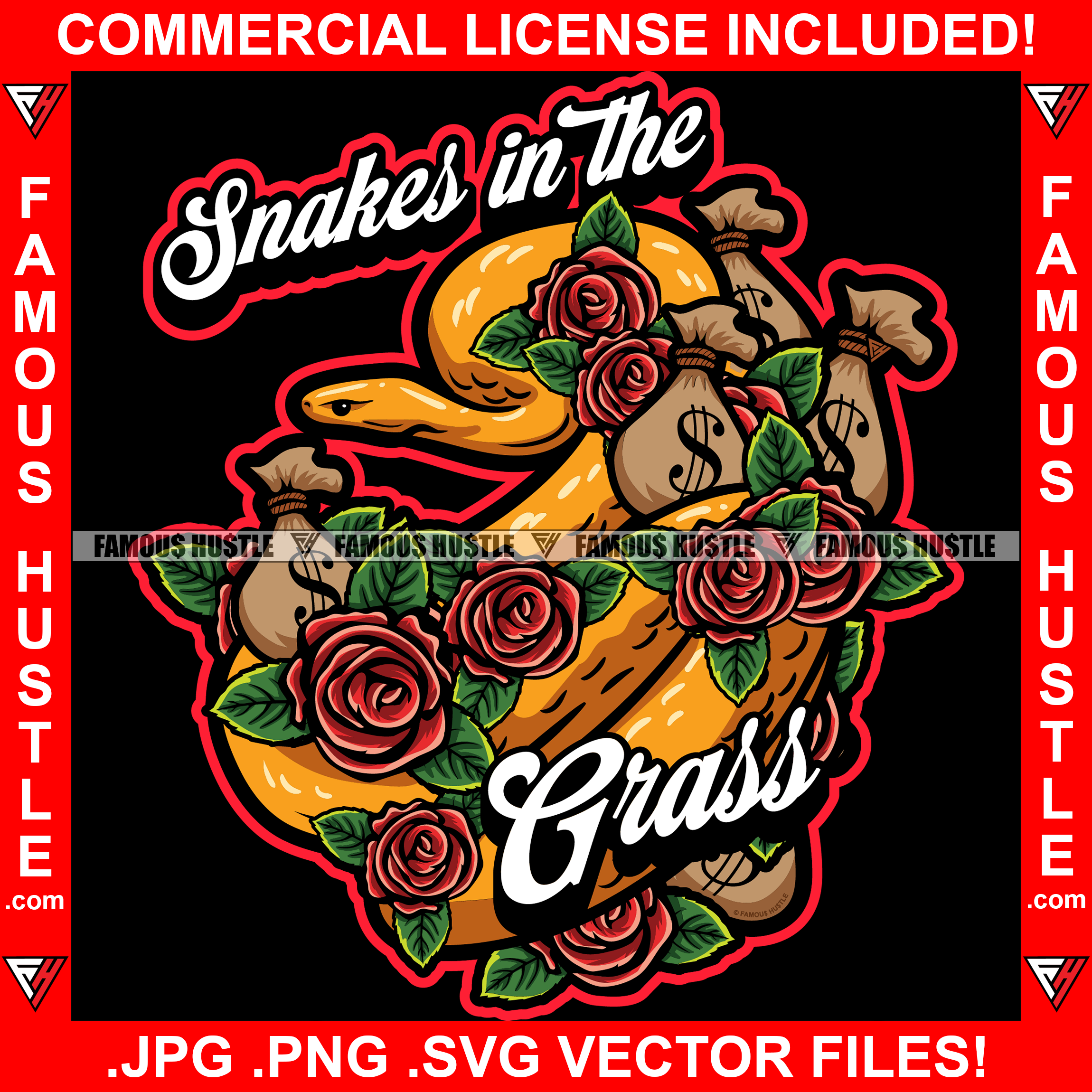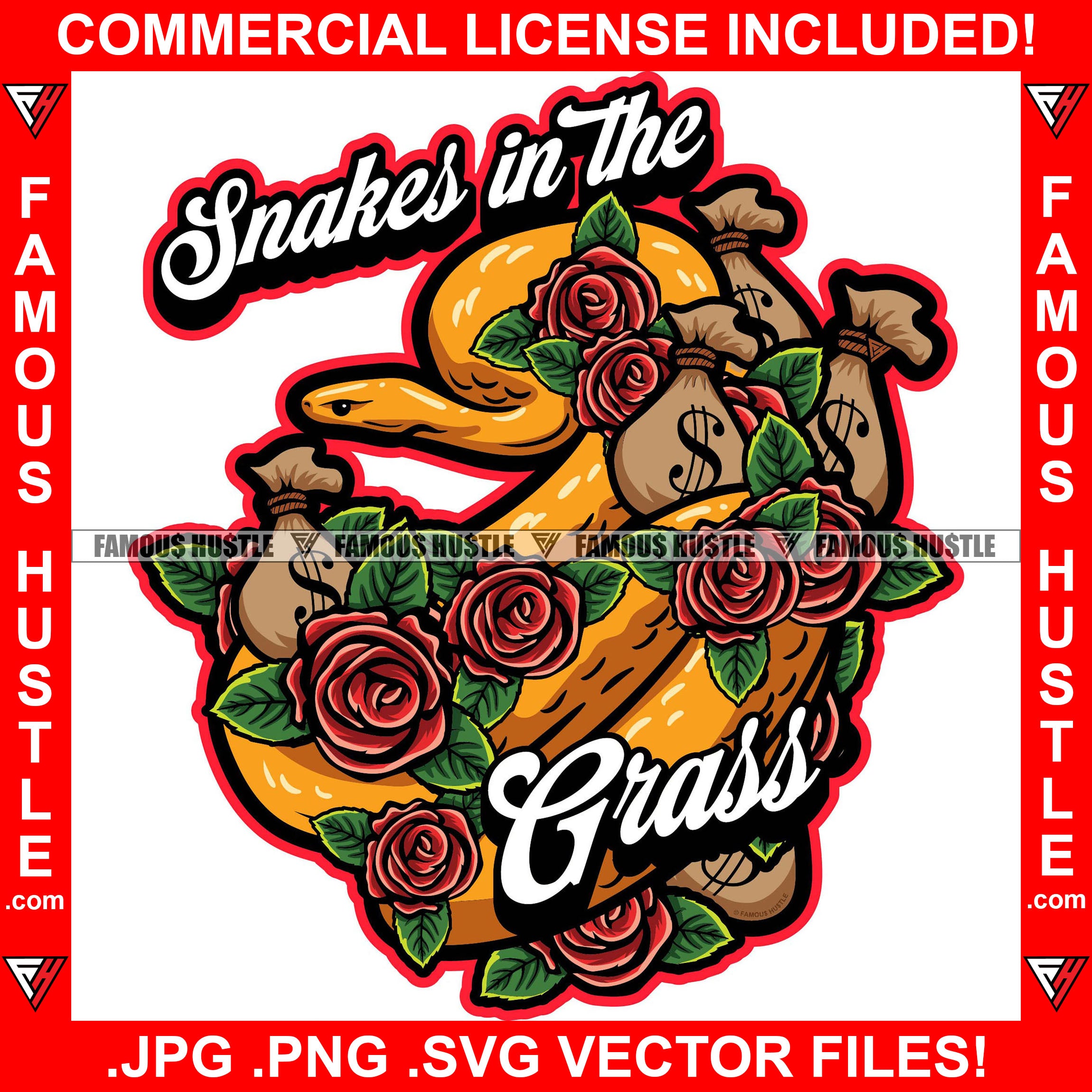 Snakes In The Grass Cash Money Bags Red Roses Hip Hop Rap Rapper Plug Trap Street Hood Ghetto Swag Thug Hustler Hustling Famous Hustle Baller Trapper Quote Art Graphic Design Logo T-Shirt Print Printing JPG PNG SVG Vector Cut File
