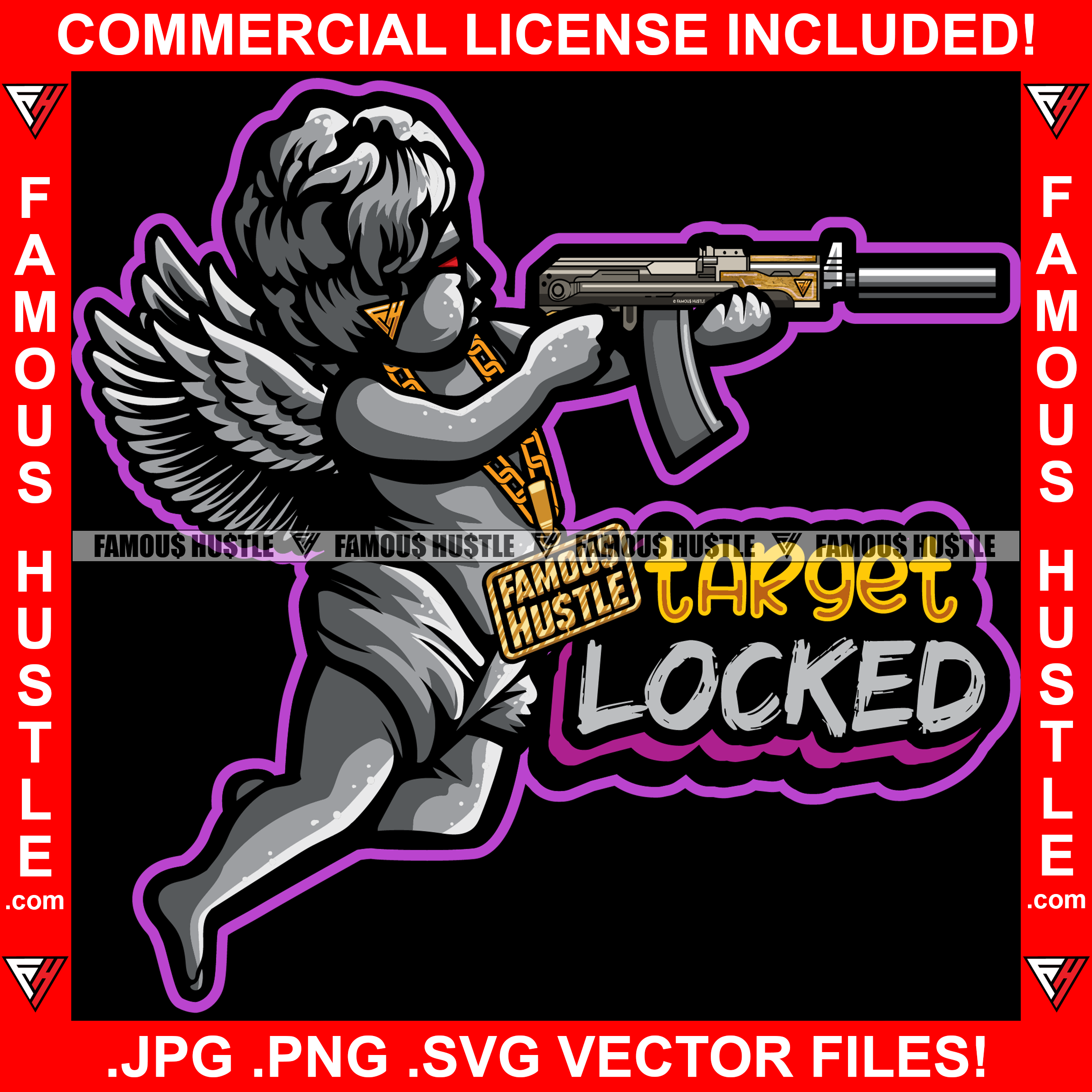 Target Locked Street Demon Famous Hustle Gangster Black Angel Wings Statue Red Eyes Gold Jewelry Necklace Firing Hip Hop Rap Street Designer Fashion Hustler Pinup Pin Up Quote Art Graphic Design Print Printing Vector SVG Cut File