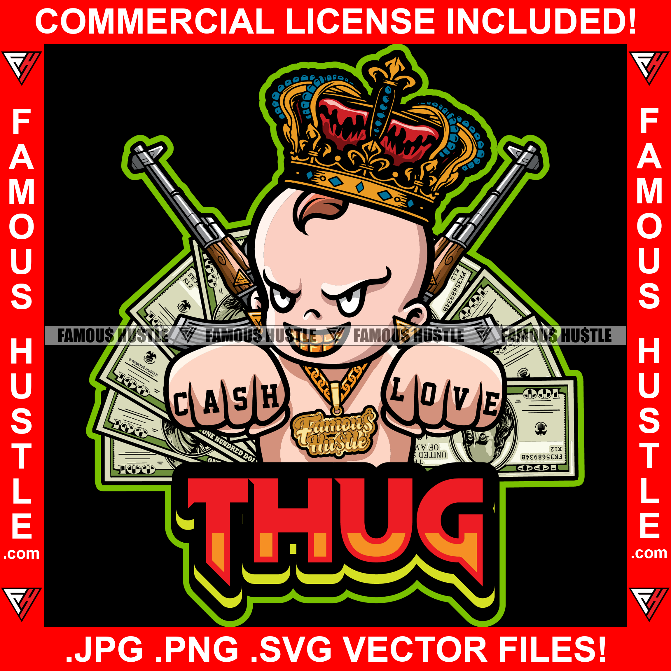 Thug Cash Love Famous Hustle King Baby Boy Money Mean Smile On Face Gold Jewelry Teeth Guns Hip Hop Rap Rapper Hustler Hustling Trap Trapper Quote Art Graphic Design Logo T-Shirt Print Printing JPG PNG SVG Vector Cut File