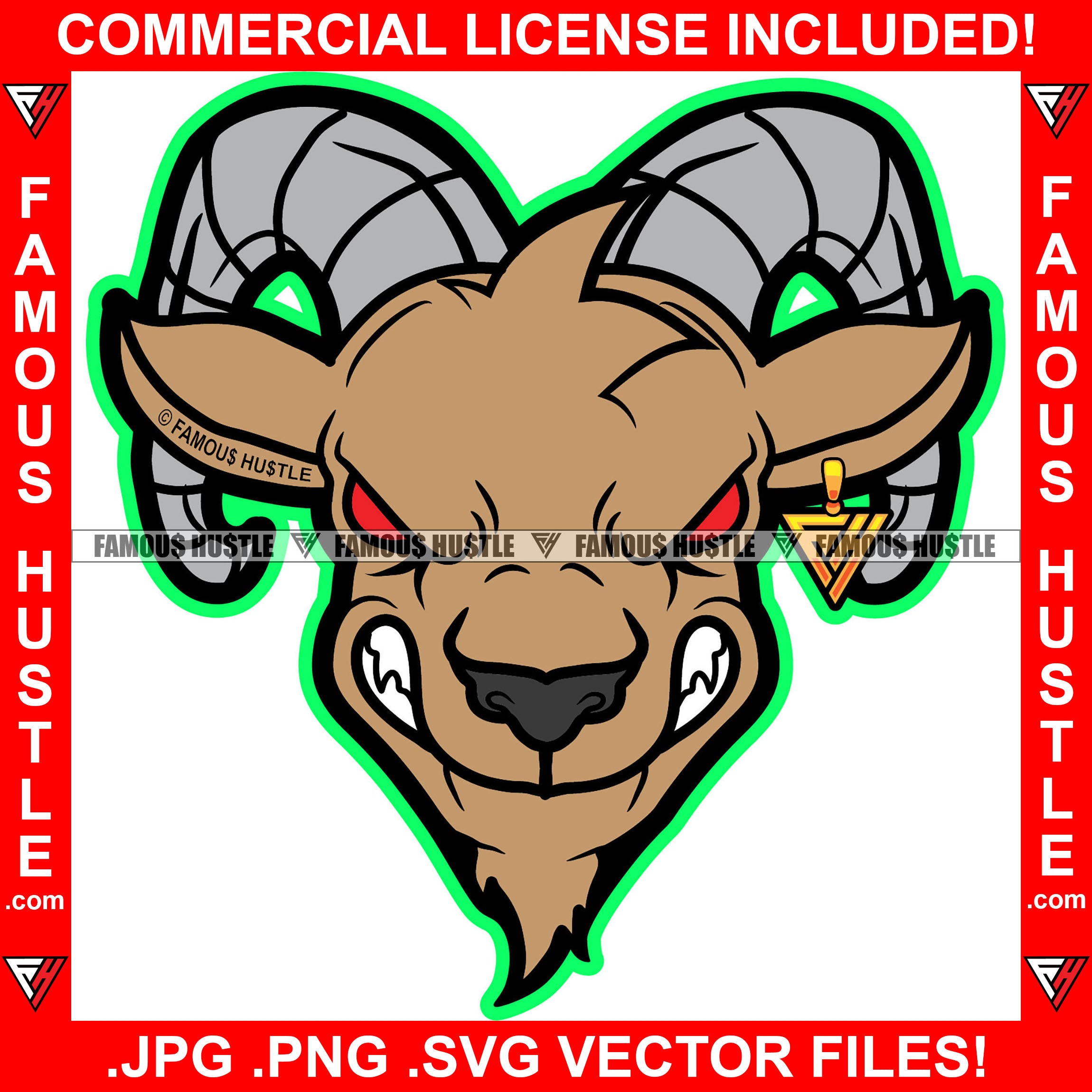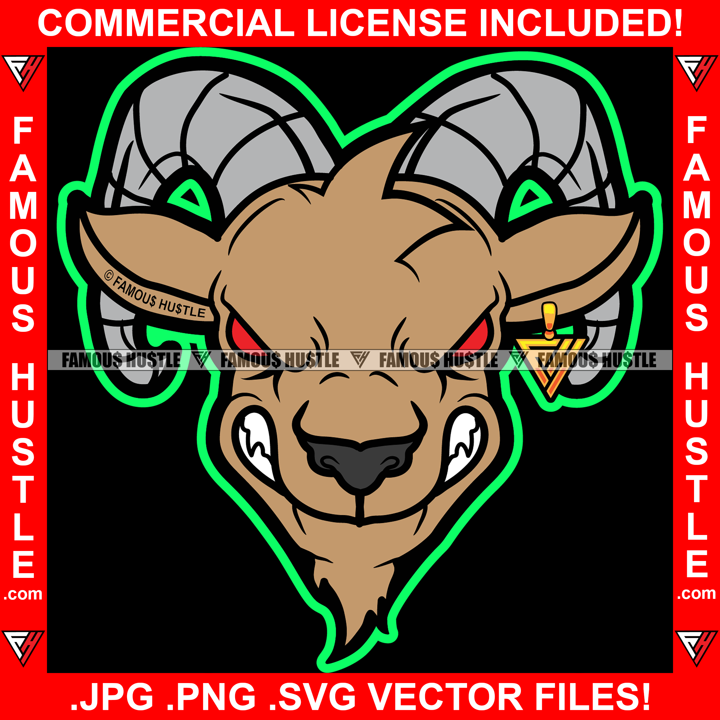 Trap G.O.A.T Goat Gangster Cartoon Character Big Horns Angry Face Gold Jewelry Red Eyes Hip Hop Rap Rapper Plug Trap Street Hood Ghetto Swag Thug Famous Hustle Baller Trapper Art Graphic Design Logo T-Shirt Print Printing JPG PNG SVG Vector Cut File