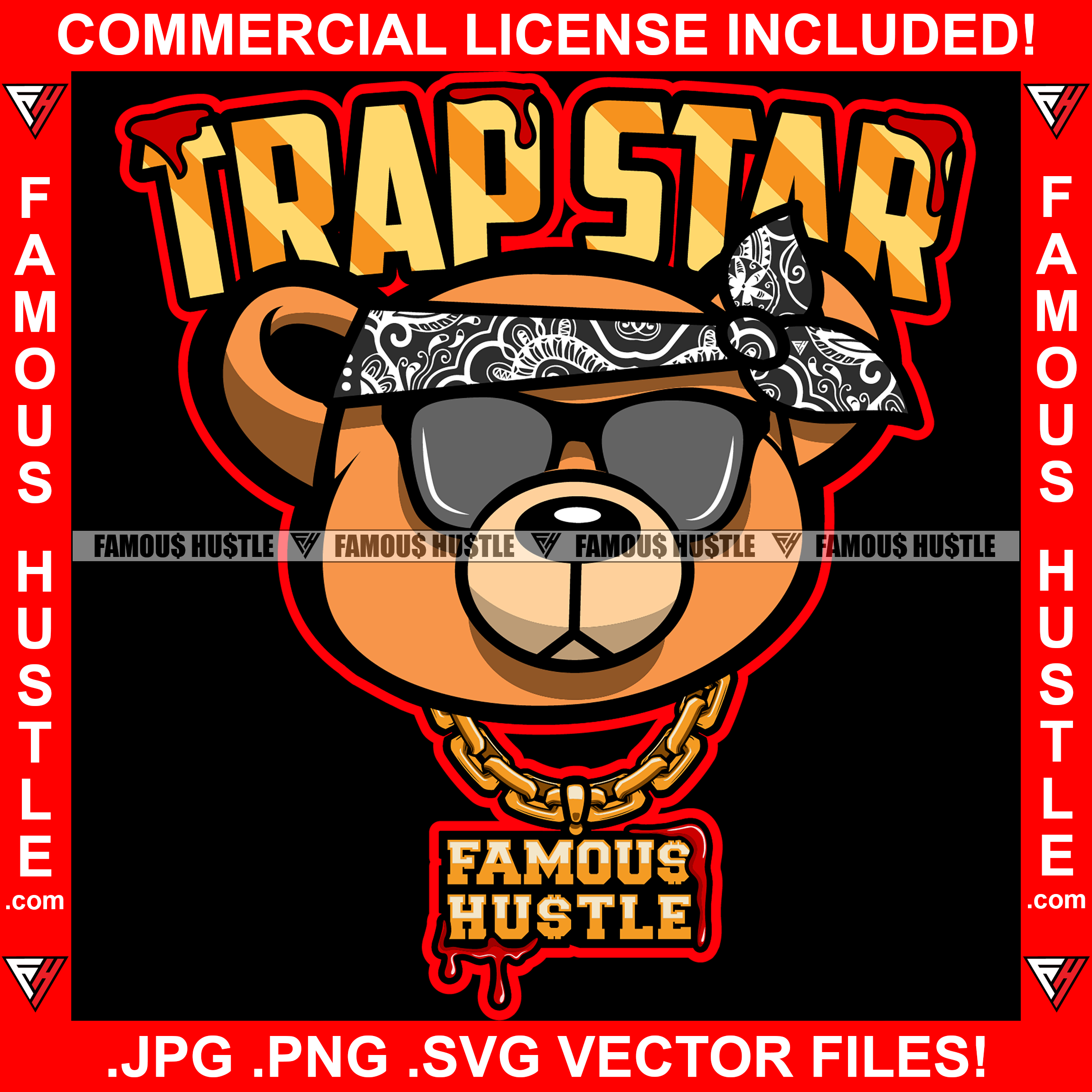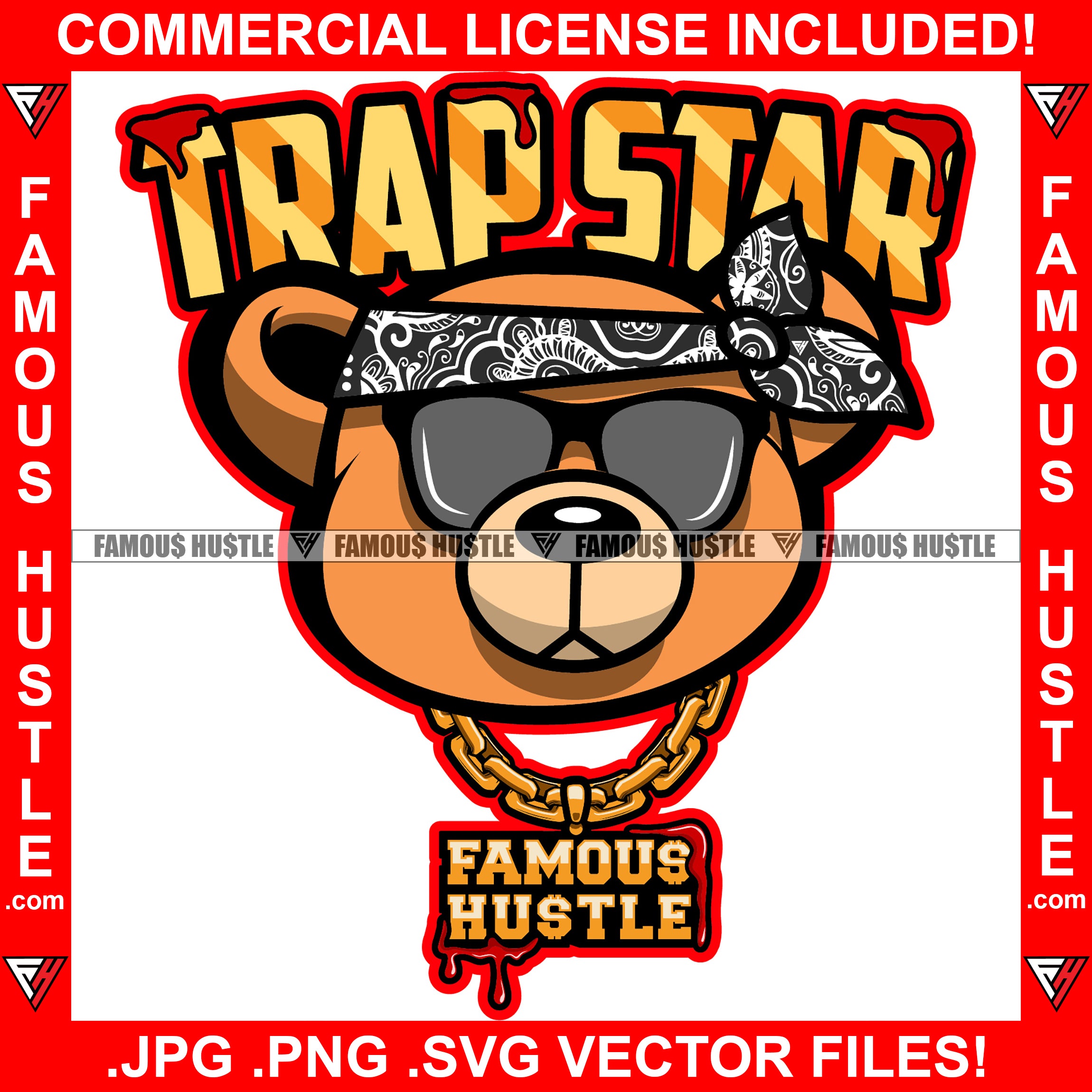 Trapstar Drugs Gangster Teddy Bear Head Bandanna Black Glasses Dollar Sign Earrings Gold Jewelry Hip Hop Plug Street Hood Ghetto Swag Thug Hustler Hustling Famous Hustle Quote Art Graphic Design Logo T-Shirt Print Printing JPG PNG SVG Vector Cut File
